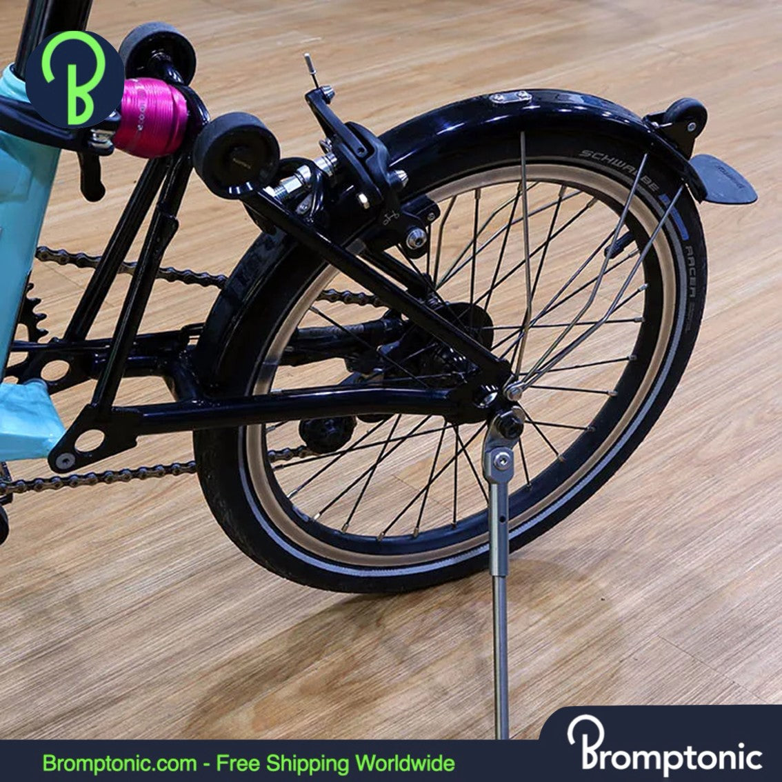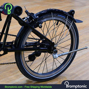 The kickstand is straightforward to assemble on the rear axle of your Brompton bike. It ensures stability when parked and conveniently folds away when not in use, maintaining the sleek look and functionality of your bike.