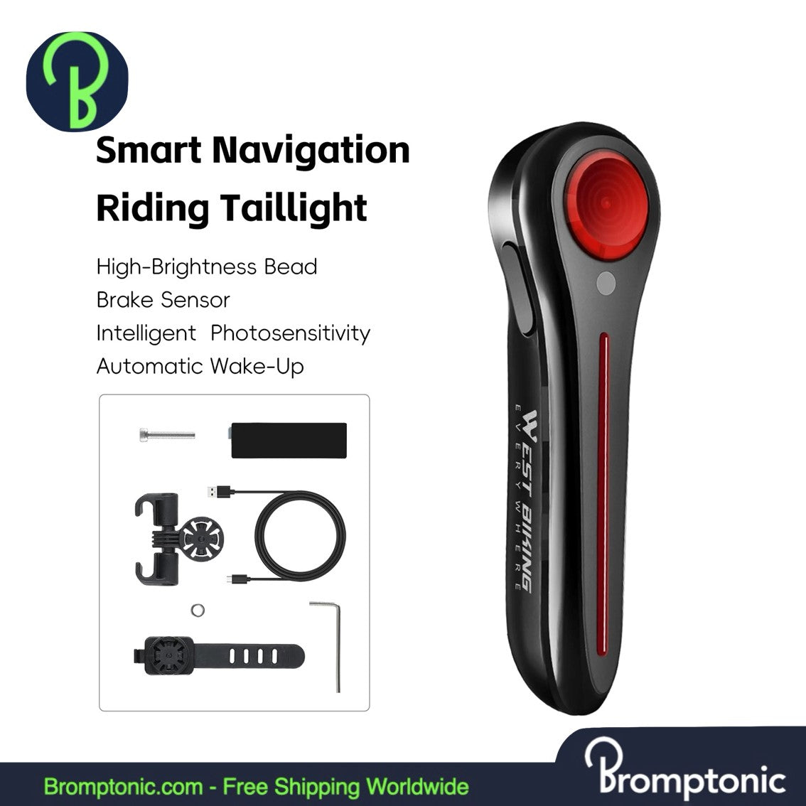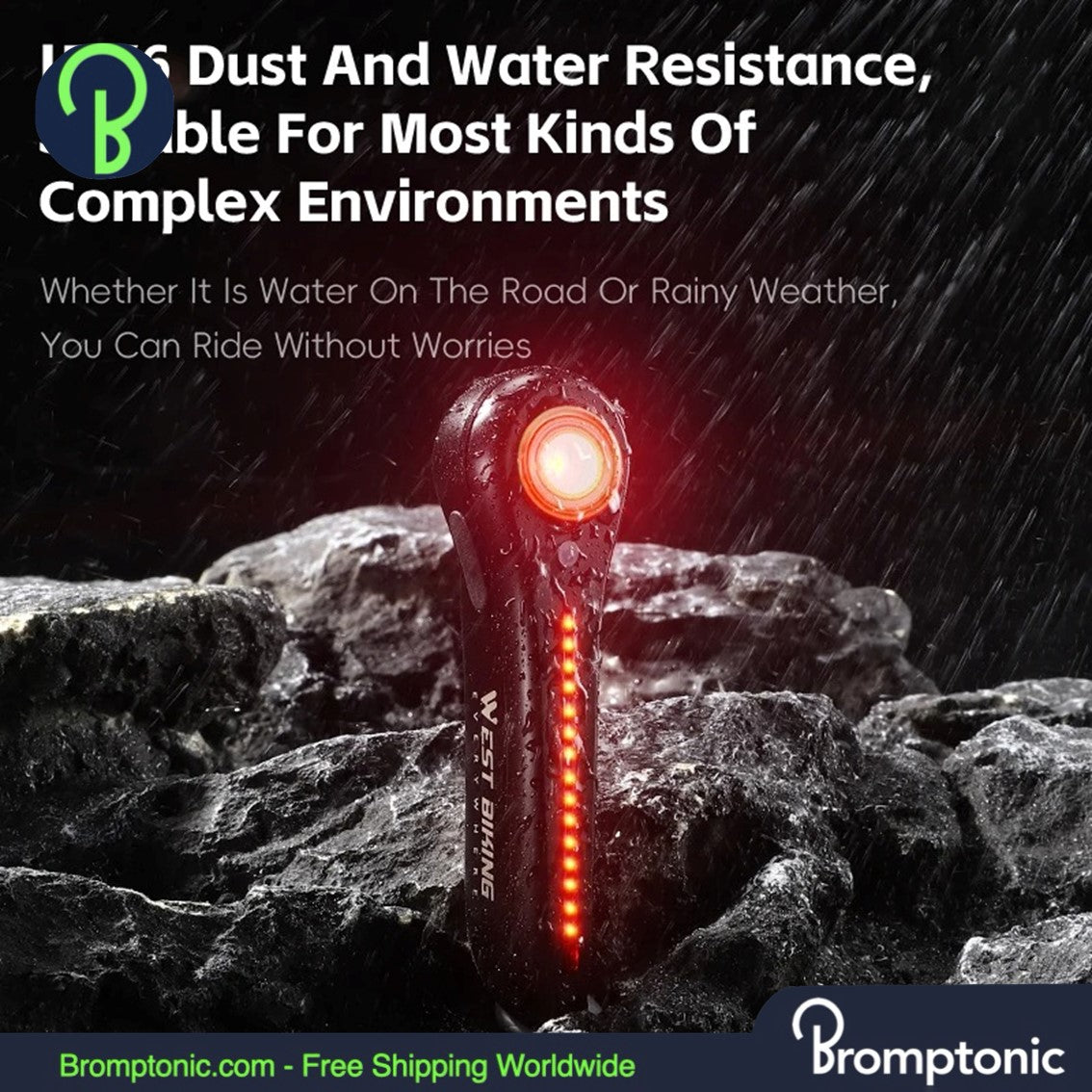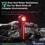 This LED rear bike light provides enhanced visibility and safety with an intelligent brake sensor that automatically activates a high-intensity warning light when braking. It is built to withstand various weather conditions with its durable IPX6 waterproof rating and offers convenient Type-C charging.