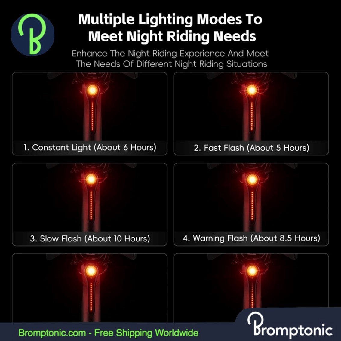 - Six Lighting Modes: Constant, flashing, and flowing light options